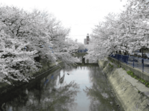 アレスコ一宮店より徒歩10分ほどの川沿いの桜並木になります。